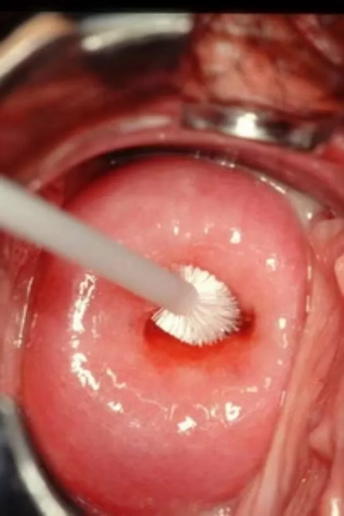 將子宮內頸刷子(Cyto brush)插入子宮頸管內,旋轉45或90度即可。旋轉次數儘量不超過2次,避免過度刺激造成出血或組織損傷